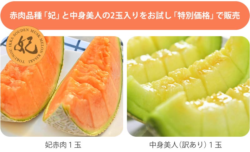 限定10箱!赤肉メロン『妃』1玉と中身美人の1玉入りがお試し価格で味わえます!華やかな赤肉と爽やかな緑肉をお楽しみください。